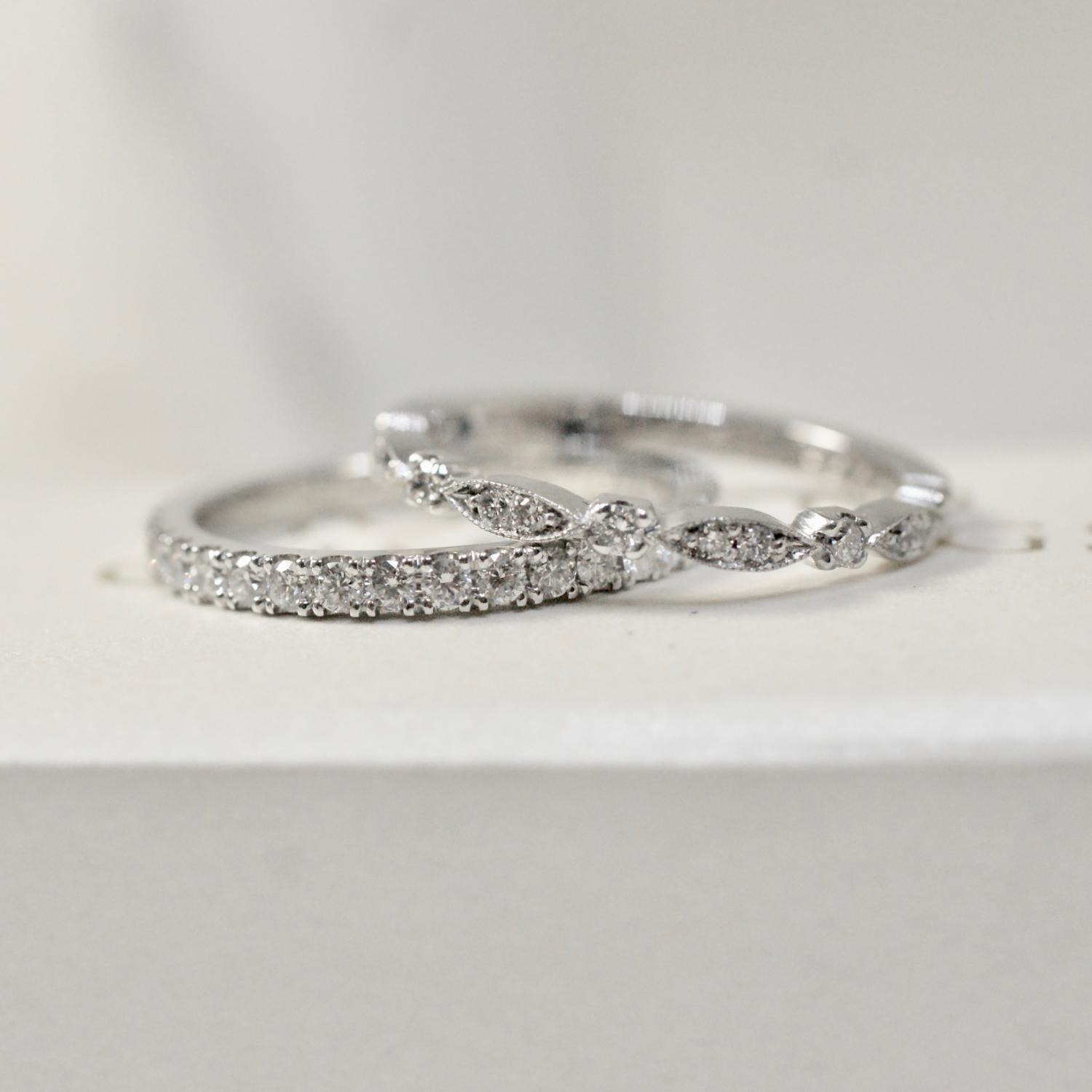 Vintagering tillverkad i 18 k vitt guld. Diamanter TW/SI1: 8 x 0,01 ct, 3 x 0,02 ct. Mått: Bredd: ca 2 mm, Höjd: ca 1,8 mm. Rak skena.